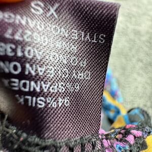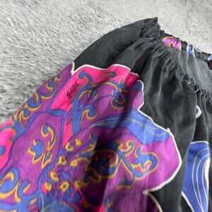 The Hale Bob Silk Boho Dress in XS features a black paisley floral pattern, 3/4 bell sleeves, and an off-the-shoulder neckline. This mini dress is perfect for various occasions including travel, weddings, parties, and casual outings. Made of silk and a silk blend, this dress is ideal for the summer, fall, and spring seasons. The pullover closure and garment care suggest that this dress is both stylish and easy to maintain, making it a versatile addition to any woman's wardrobe.