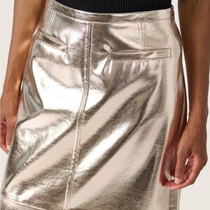 Statement metallic midi skirt in a high-shine silver vegan leather. Features a clean, structured silhouette with a front slit for easy movement and a super flattering fit. Gives major modern Y2K / minimalist / futuristic vibes.