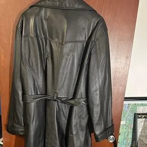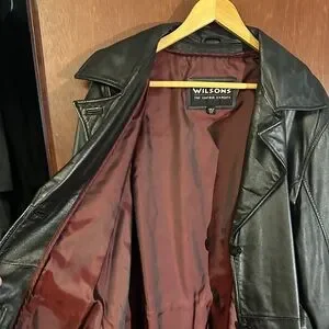 Sleek black leather trench coat by Wilson. Features a classic design with a belt for a tailored fit. Ideal for stylish outings. Originally manufactured with quilted zip out lining that is no longer available