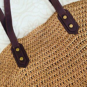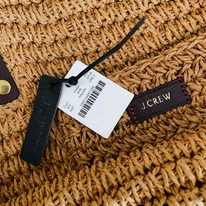 New with tags and so on trend. Constructed of resilient woven straw, this pretty golden brown tote bag includes genuine leather straps accented with rich gold metal hardware and an inside pocket for storing keys, etc. - the perfect everyday bag designed for multi-purpose use. The leather straps show a few minor creases in spots due to how the tote was packaged by J.Crew, but this is not very noticeable. Folds flat for easy packing and is roomy enough for toting all of your essentials, whether it's for a day at the beach or a day running errands. Body: 100% Straw. Trim: 100% Leather. Measurements: 18" long across top, 13" long across bottom, 15" width at top, 8" width at bottom, 16" deep (excluding straps), strap length/rise 10".