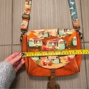Features a cute vintage camper fabric, soft suede, adjustable strap, cute leather tassel