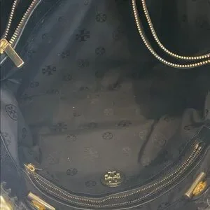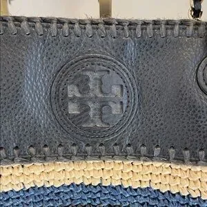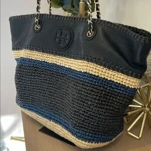 Stylish Tory Burch tote with woven texture. Features black and cream colors. Elegant chain straps. Perfect for daily use.