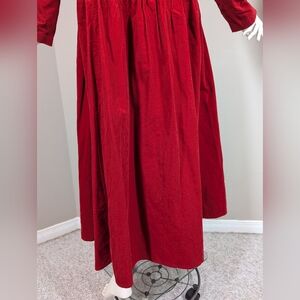 Vintage Laura Ashley red corduroy midi dress with a soft fine-wale texture, long sleeves, and a gathered skirt for a classic romantic silhouette. Features subtle puff shoulders, a clean front, and a full button-back closure. Timeless cottagecore and prairie-inspired piece with elegant vintage structure, perfect for fall and winter layering.