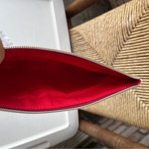 Colorful plaid clutch with a tassel accent. Features a mix of red, yellow, blue, and black colors. Red interior. 9.5” wide. 6” height