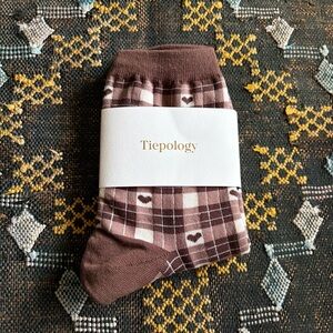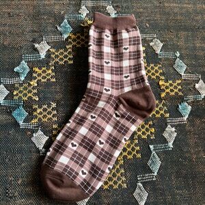 Tiepology socks, made in Korea. So cute & amazingly sturdy. You will get compliments. In Brown and natural plaid with hearts here & there! Perfect for Valentine's Day!
