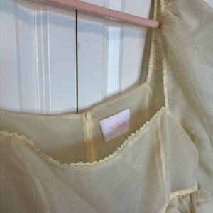 Elegant cream dress with delicate puff sleeves. Ideal for any occasion. Only worn a few times. The top part is very see through so I recommend wearing a nude or yellow bra with it!