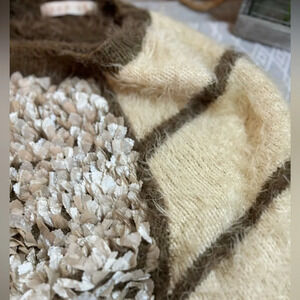 Egoist Sweater Multi-material with Pedal like design, stripes, mohair look. Likely Size Small. Korean brand based on the Korean tags. Brown and cream.