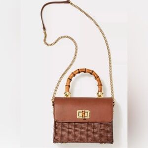 • Wicker bag with a natural bamboo top handle, turnlock closure, and detachable gold metal chain crossbody strap.
