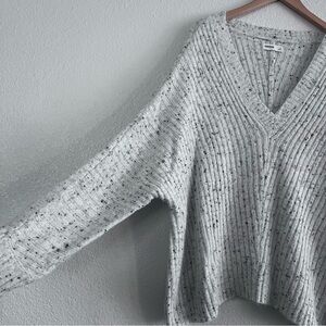Chic and comfortable V-neck sweater. Features a speckled gray design. Ideal for layering.