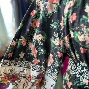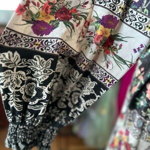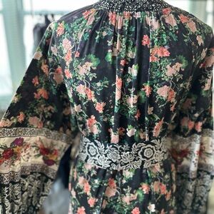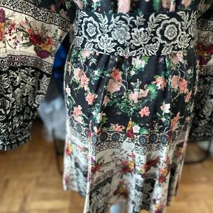 Chic mini dress with vibrant floral patterns. Features bold black and cream contrasts. Ideal for most any occasion!