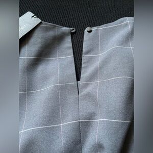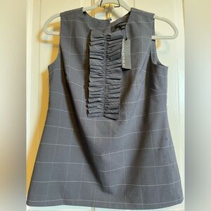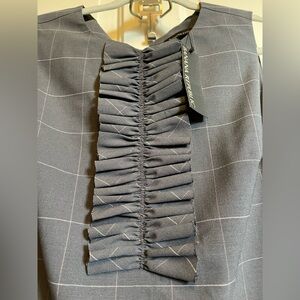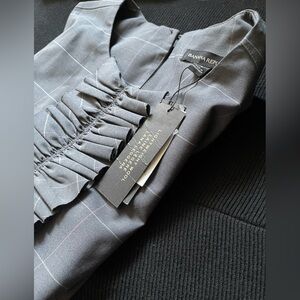 Elegant charcoal blouse with subtle checkered design. Features a stylish neckline detail.
