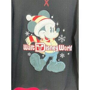 The coziest way to bring a little Disney magic to winter days. This Disney Parks Walt Disney World crewneck pullover features a bold Mickey Mouse Santa graphic on classic black, with festive red/white ribbed trim at the collar, cuffs, and hem. Soft fleece lining keeps you warm without feeling bulky, and the regular fit makes it easy to layer. Perfect for holiday parties, Christmas mornings, park trips, or casual weekends. Condition: Pre-owned.