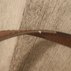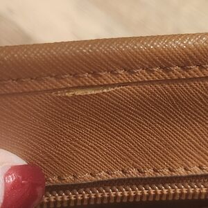 Flaws on handles normal wear. Tiny spot on bottom. One small tear on inside top on vinyl. Strap has some wear. Inside is very clean. Excellent small tote.