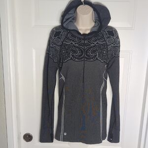 Stretchy athletic hoodie jacket from Athleta, size large. Black with gray stripes, floral and paisley pattern across the shoulders and back. Half zip front, has thumb holes. Has a slimming fitted look. Great condition - no rips, stains, holes etc and comes from a smoke-free home. 63% nylon, 35% polyester, 2% spandex.