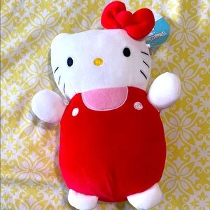 Charming Hello Kitty plush with a bright red dress. Soft white fur and cute bow.