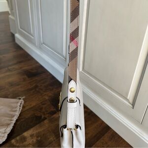 House check pattern, gold hardware, magnetic snap closure front, single adjustable shoulder strap, inside zip pocket, and slip pocket, Beautiful Condition