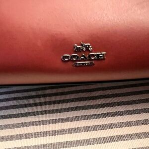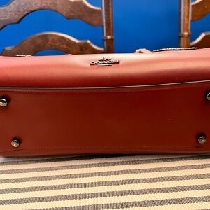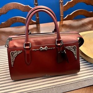 Chic Coach satchel in maroon. Features elegant studded accents and a bow detail. Perfect for stylish outings.