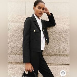 Sophisticated black blazer with gold buttons. Tailored fit. Ideal for formal occasions.
