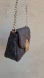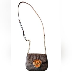 Michael Kors crossbody bag in the classic brown signature monogram print with a gold-tone chain strap and hardware, in good pre-owned condition with no peeling or corner wear and a clean exterior; the hardware shows slight discoloration and light scratches from normal use but does not take away from the overall beauty of the bag, and the interior lining is mostly clean with some signs of wear; it measures approximately 7.5" x 5.5" and features a magnetic snap closure under the flap, one main interior compartment, and one interior slip pocket, making it a stylish and easy everyday crossbody.