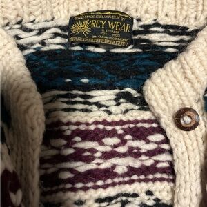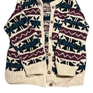 Warm knit cardigan featuring a stylish pattern. Cream base with black, purple, and turquoise accents. Perfect for layering. Good vintage condition.