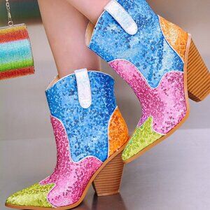 Step out in style with these vibrant sequin boots. Featuring a dazzling mix of blue, pink, and green, these boots are perfect for making a statement. Ideal for adding a pop of color to any outfit.