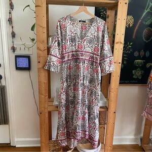 Midi to maxi dress in printed 100% cotton with slight flare 3/4 sleeves, pockets, lace details. Hot pink and white print inspired by Batik prints from Indonesia.