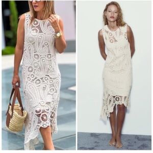 Crocheted midi dress. Round neckline. Tonal matching fabric lining. Asymmetric hem.