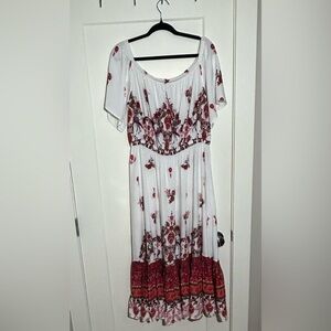 City Chic size S /16 maxi dress. 100% viscose unlined. Can be worn off or on the shoulder. Perfect boho beach vacation dress. Only worn once, in EUC.