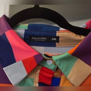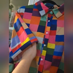 Vibrant multi-colour checkered/plaid short sleeve button up shirt with collar and drop shoulder. Features a mix of bold colors for a standout look and a relaxed/loose fit.