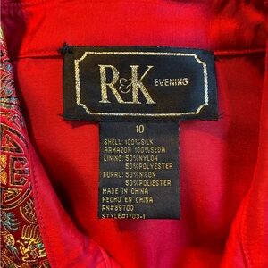 Elegant red silk Blazer, 100% silk, featuring intricate circular patterns. Never worn. Inside is fully lined. Perfect for adding a touch of sophistication to any outfit. No buttons or zippers. Perfect for lunar new year celebrations.