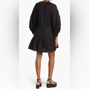 Elegant black mini dress with puff sleeves. Features a button-down front and ruched design. Perfect for a night out.