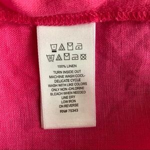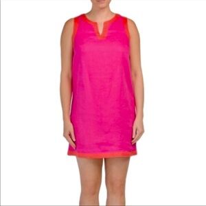 A-line linen shift dress; above the knee length; sleeveless; bright pink with orange trim; pullover; v-neck; size Medium. Perfect summer dress.