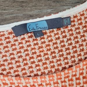 Pullover style, lightweight and unlined with semi sheer orange and white knit body and wispy white feather trim lower hem.