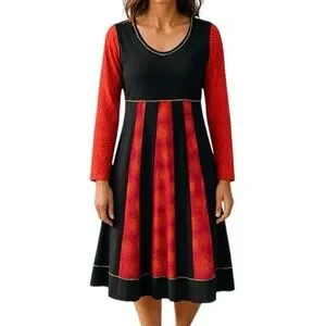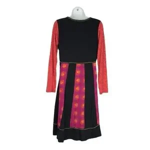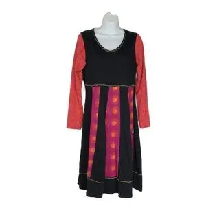 The dress is primarily black with long sleeves that have an orange and red swirling pattern. The skirt portion of the dress incorporates panels of fabric with a pink and orange circular design, separated by black panels. Comfy fit with an eye-catching pattern and fit and flare style. I’m 5’8” and this dress falls just below my knees.