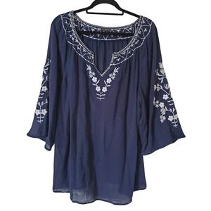 Talbots Plus Navy Blue Embroidered Cotton Boho Tunic Top Size 2X Crinkle gauze