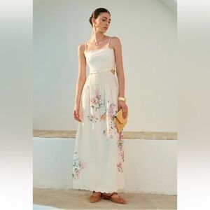 Elegant white maxi dress with floral design. Features spaghetti straps and a fitted bodice.