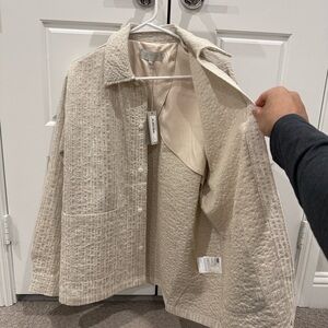 Elegant cream overshirt with boucle texture. Features a collared design.
