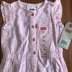 Levi’s floral jumpsuit. Baby girl’s size 12 months. Light pink, white in color. Button front. Snap closure on legs. New with tags. Never worn. No stains or tears. From smoke free and pet free home.