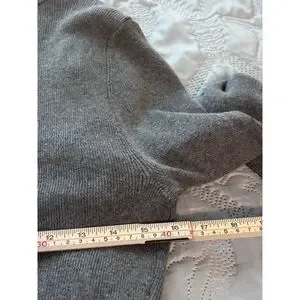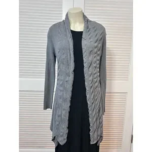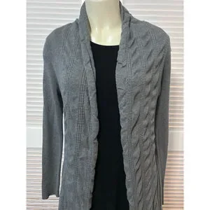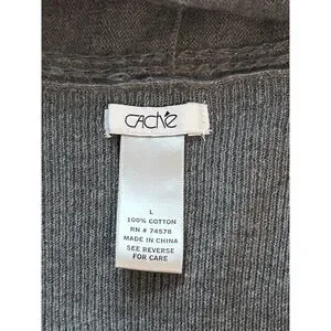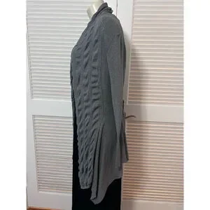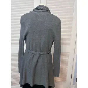 This women’s Cache gray cotton cardigan sweater in size large is a timeless, elegant layering piece designed with high-quality craftsmanship and stylish detailing. The sweater features a draped open front with a wide ribbed shawl collar, adding texture and sophistication. It includes a removable black faux leather belt with a bronze-tone buckle for a flattering, cinched silhouette. The front showcases vertical textured panels, while the back is ribbed for a contoured fit. Finished with long sleeves and an asymmetrical hemline that falls longer at the front for a flowing, modern look.