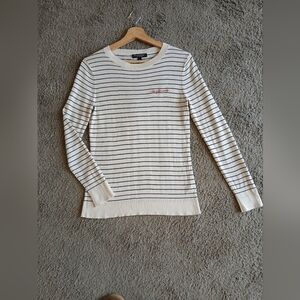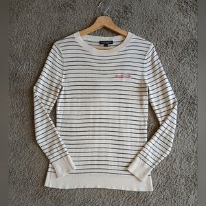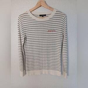 Stylish cream and black striped sweater with red embroidery.