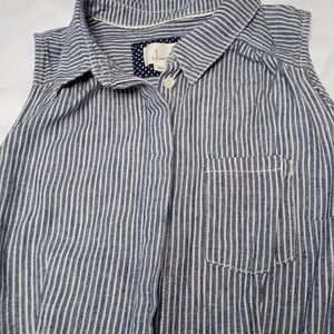 Sleeveless jumpsuit with button front. Features a tie waist. Blue and white stripes. #jumper