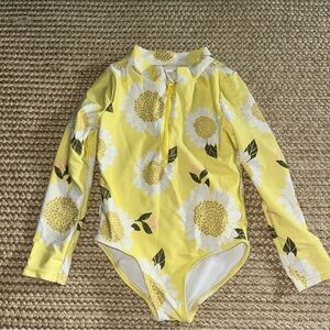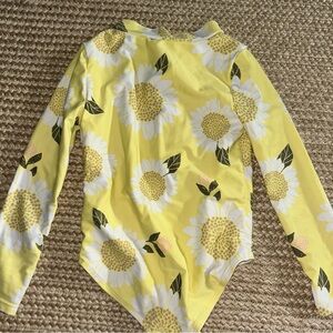 Vibrant yellow rashguard with sunflower design. Long sleeves for sun protection. Ideal for beach or pool.