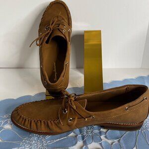 Stylish brown leather loafers. Features lace-up design. Comfortable and versatile.