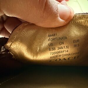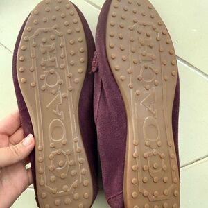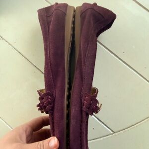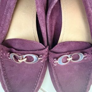Elegant Coach loafers in rich burgundy. Features signature hardware detail. Perfect for versatile styling.