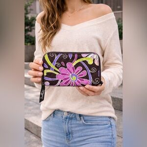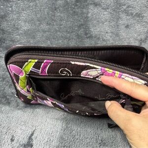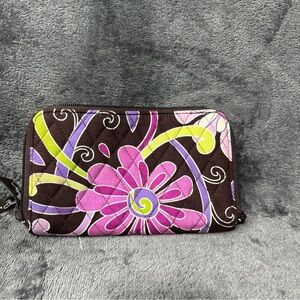 The Vera Bradley large zip around wallet in brown and purple features a vibrant multicolor design that is perfect for women on the go. This wallet offers ample space for organizing your cards, cash, and other essentials while the zip-around style provides easy access to all your belongings. With its trendy design and practical functionality, this wallet is a stylish accessory that keeps your everyday essentials in order.