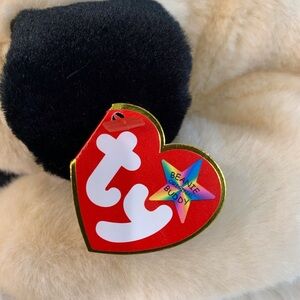 Adorable plush dog toy by Ty. Soft cream body with black accents. Ideal for play and cuddles.