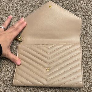 Elegant Yves Saint Laurent clutch in a chic beige color. Features a quilted leather design with the iconic Yves Saint Laurent logo. Perfect for adding a touch of luxury to any outfit. No box or dust bag.