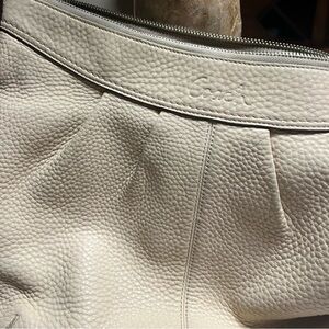 Chic Coach shoulder bag in cream leather. Sleek design with a comfortable strap. Ideal for versatile styling.THIS IS A PROJECT BAG PLEASE VIEW ALL OF THE PHOTOS!!!! W’14 H’14