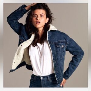 Aritzia Denim Forum The Ella Sherpa Lined Denim Jacket Dark Wash Size Large. Super cozy for colder fall days. Size large. Excellent condition other than a small amount of discolouration on the inside of the Sherpa collar.