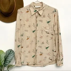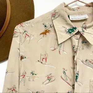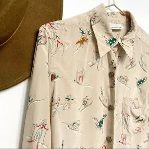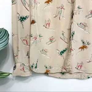 Tan silk button down blouse with adorable winter scene print